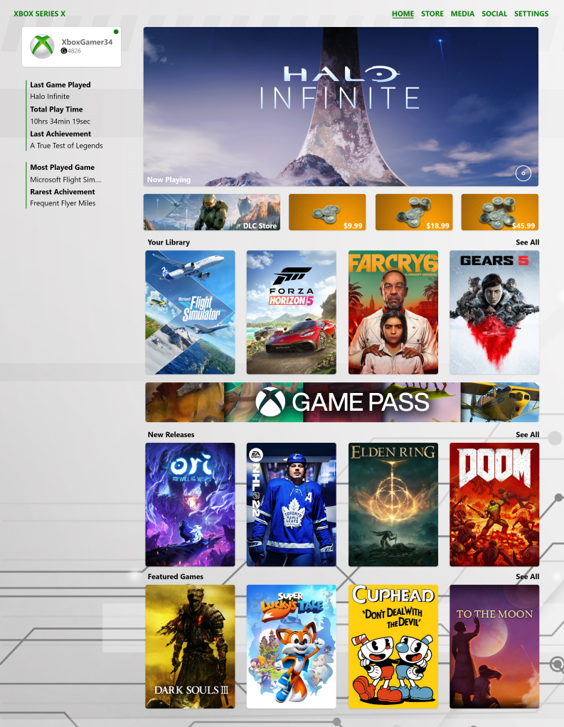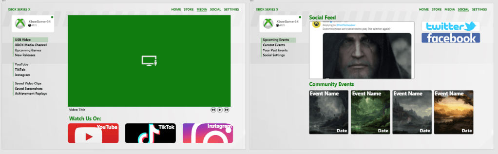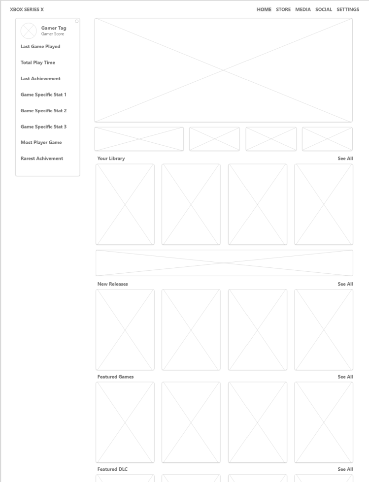 For my first post-class project I decided to go personal and take a crack at re-working the main menu on the Xbox One/Series consoles. My reason for doing this is when I bought an Xbox Series X last year, I was expecting that new console experience. But when I started it up, I was greeted with the exact same screen that was on my Xbox One X. It was nice that it was familiar but also a tad disappointing given I just dropped $500 on a new console and didn’t quite have that new console experience. I bought a PS5 as well and when I started that up it felt like an event, complete with a new menu system. Sure it had a similar style to the PS4, but it wasn’t an exact copy so it still felt fresh.