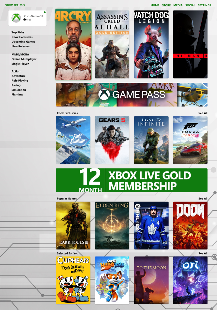 For the guide menu I thought of just a small drop-down menu to try and keep a sleek, modern look. That ended up changing and getting bigger. The store features the same style of card system, but the top selections are larger and will change depending on what submenu the user is on. Below that is a bar to access Game Pass and then a selection of other games like new releases, tailored selections and exclusives will follow below.