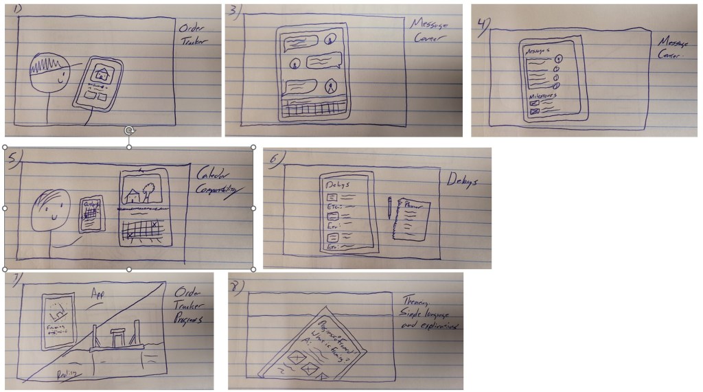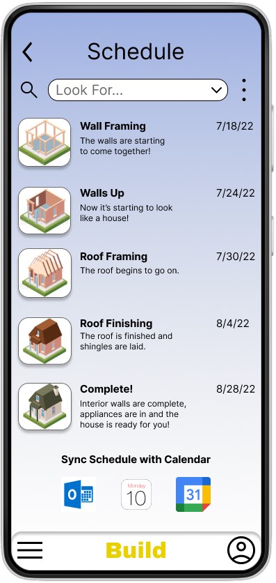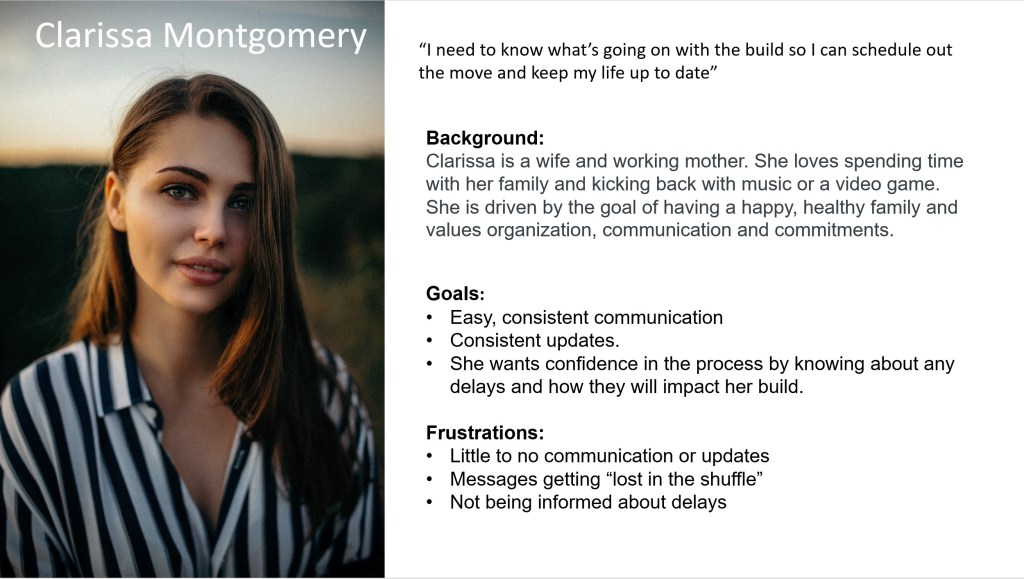 Rationale: One common frustration uncovered during the interviews was not knowing where in the process the home build was at. Many customers are out of state or town and can’t stop by to see the process, so this gives them an idea of how far along it is.