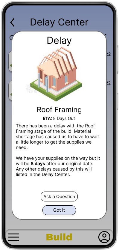 Rationale: Users overwhelmingly wanted to know why a delay is happening. Not necessarily the root cause but what it is and how it is going to impact the build. While delays are very common in building a house, having them available to view in the app and see them being worked through can make it easier to understand them.